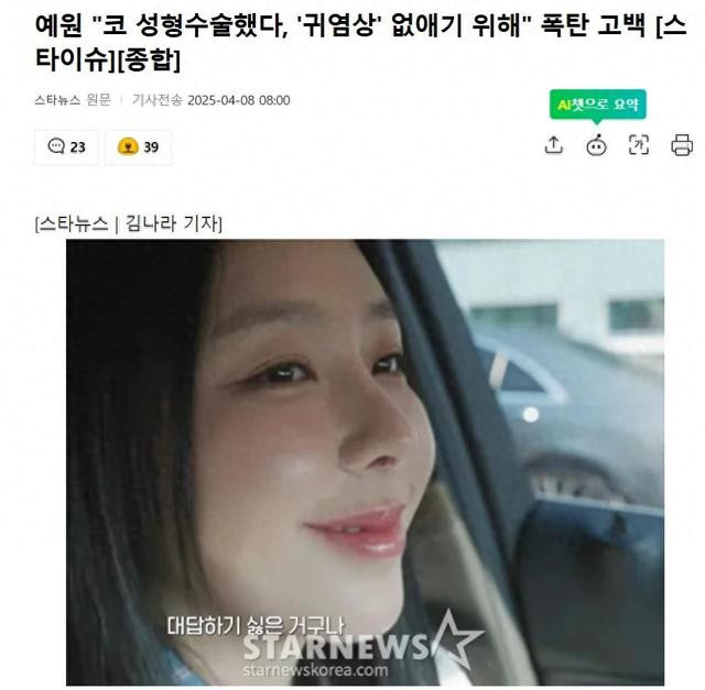 总之,金艺媛这波自曝鼻整形+改变形象的决心,真的让人佩服她的勇气!大家觉得她的新鼻子怎么样呢?更喜欢她以前的可爱风格,还是现在的成熟感?对于韩国人气女星金艺媛自曝:“最近整了鼻子”,大家怎么看呢?快来评论区和小娱聊聊吧!别忘了点赞关注,咱们下期见~